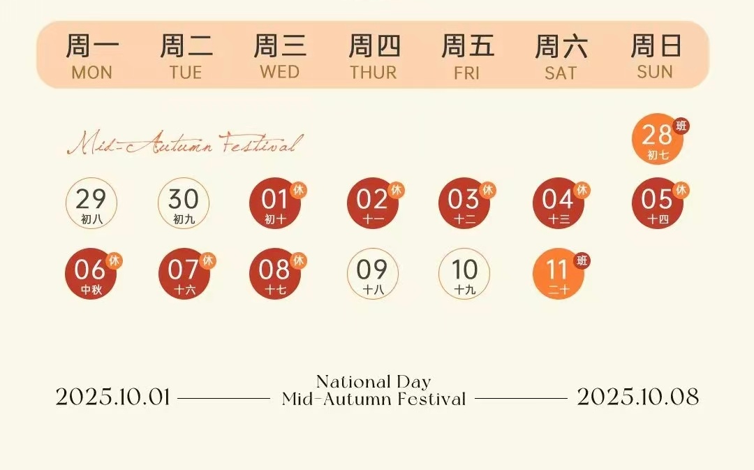 A medida que se acercan las festividades del Festival del Medio Otoño y el Día Nacional, nos gustaría aprovechar esta oportunidad para enviarles nuestros más cálidos saludos y deseos a ustedes y sus familias.